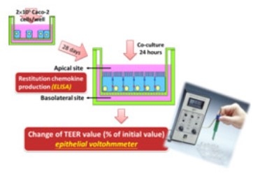 以Caco2人類結腸細胞株模擬腸道上皮細胞,利用其細胞極化特性生長成單層腸道細胞;再將樣品加入後,測定細胞激素分泌情況,以觀察腸道細胞其生長、活化、修復與調節之能力。