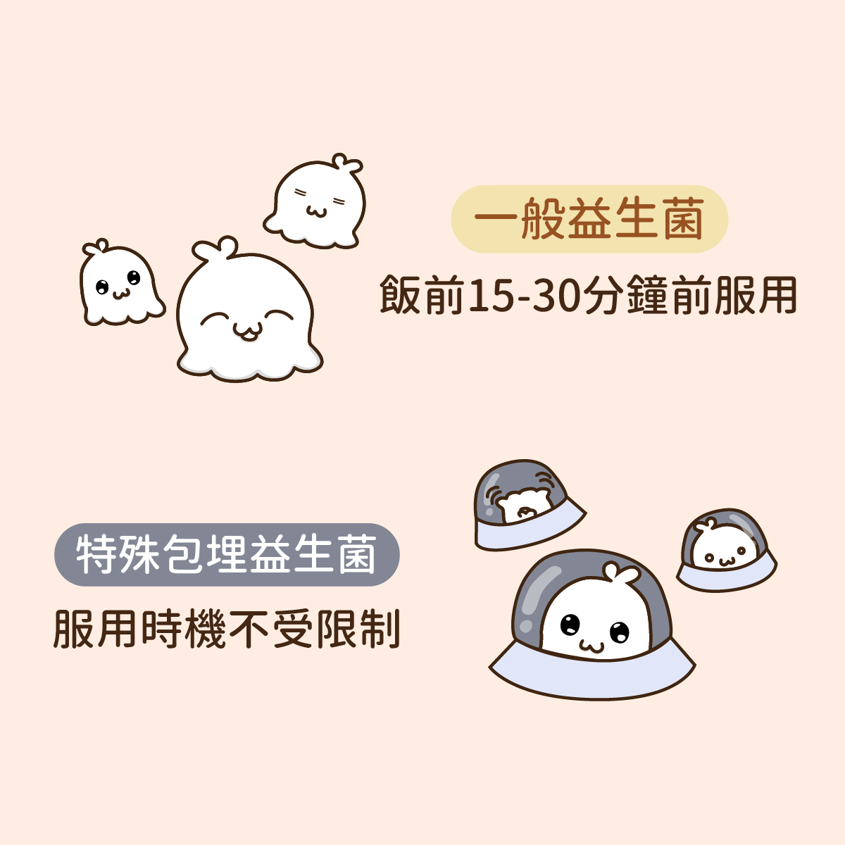 益生菌吃下去之後,首先會到達胃部,之後才會抵達作用地點「小腸」。不過胃部是一個強酸的環境,非常不利於益生菌存活,也因此若使用的益生菌是沒有特殊包埋技術的,請務必在胃酸較少的飯前食用,減少益生菌停留在胃被消化殺死的時間。但若有特殊包埋技術保護益生菌的話,就像是穿著防護衣,可避免胃酸消化益生菌,讓能夠作用的益生菌數量最大化。