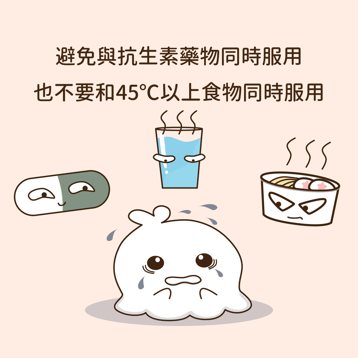 當在抗生素的療程中,同時服用抗生素和益生菌,會使益生菌的效果大打折扣!因為抗生素就是拿來抗菌或殺菌的藥物,要是益生菌與抗生素一同服用,不只壞菌死光光,就連益生菌也會受到波及。因此若在抗生素療程中欲補充益生菌,請與抗生素服用時間錯開2小時,避免剛下肚的益生菌還沒開始作用就死光光。