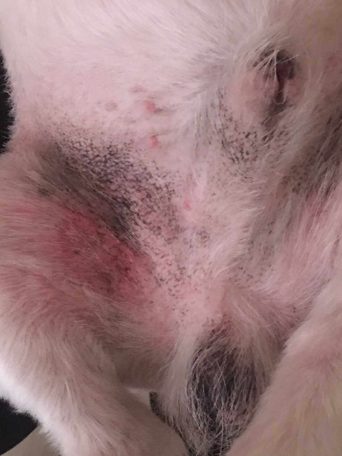 去年因為家庭因素從高雄搬到北部,冬天的濕冷讓他的皮膚症狀又一一浮現,因為天氣冷喜歡整天窩在睡墊,腹部皮膚紅腫搔癢,到了夏天情況更不好,因為天氣熱Jimmy皮膚容易出油,讓皮膚的黴菌有了一個很好生長的環境,搔癢的頻率增加也越來越明顯,即便依照過去的飲食並增加環境清潔皆未獲改善。Jimmy已邁入老犬生涯,腸道及免疫力都已漸季老化