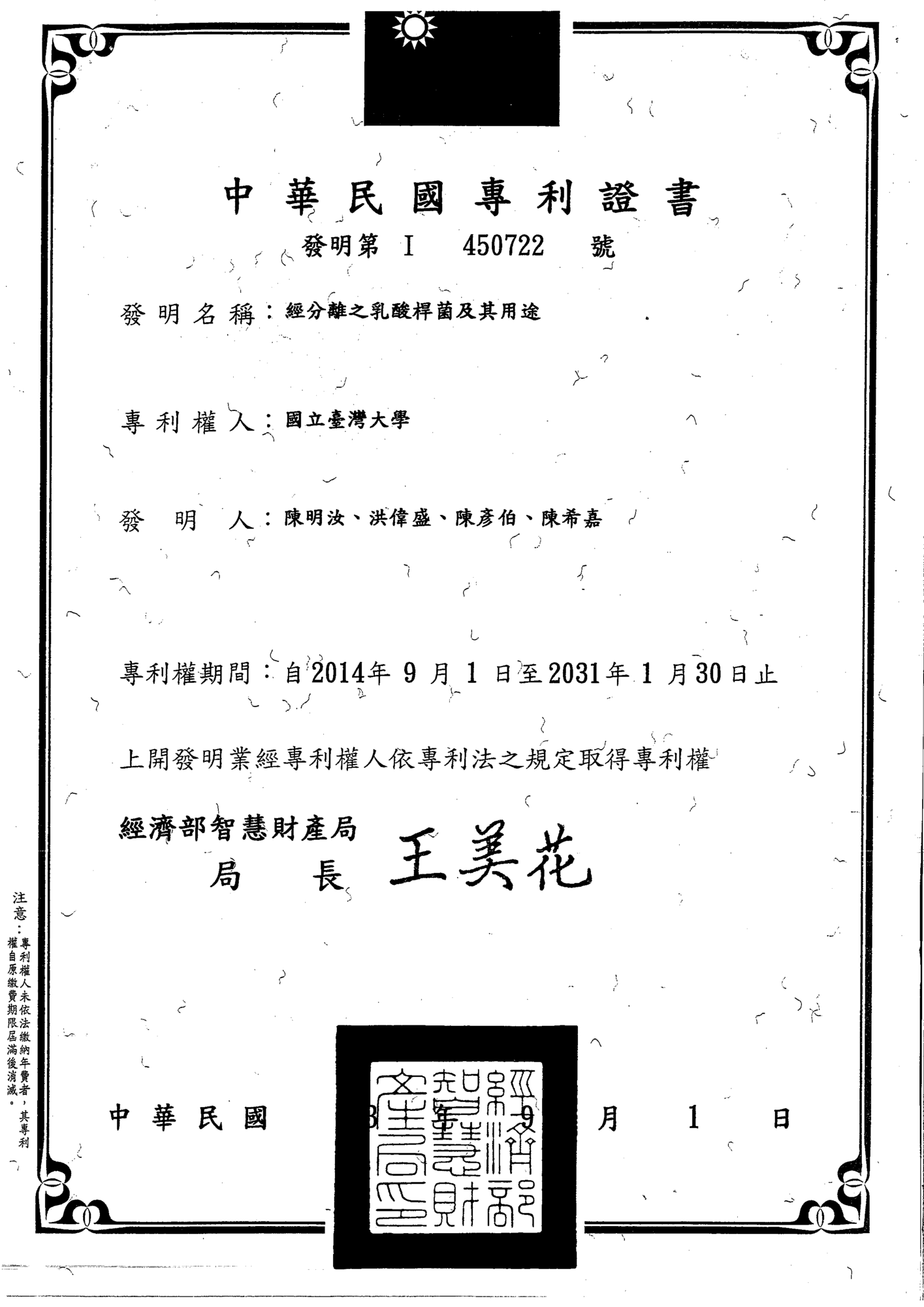 M1菌株專利證書