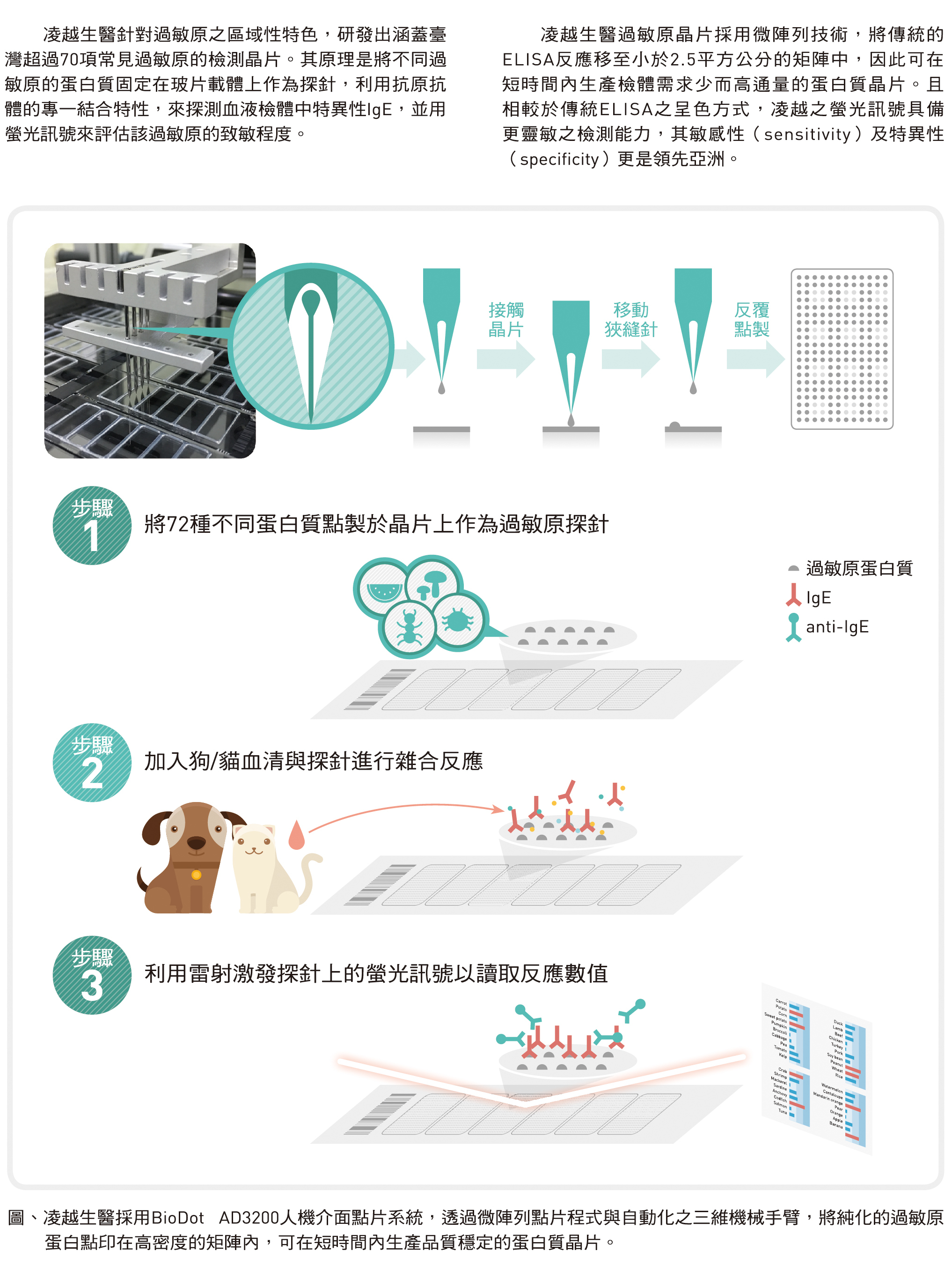 凌越生醫針對過敏原之區域性特色,研發出涵蓋臺灣超過70項常見過敏原的檢測晶片。其原理是將不同過 敏原的蛋白質固定在玻片載體上作為探針,利用抗原抗 體的專一結合特性,來探測血液檢體中特異性IgE,並用螢光訊號來評估該過敏原的致敏程度。