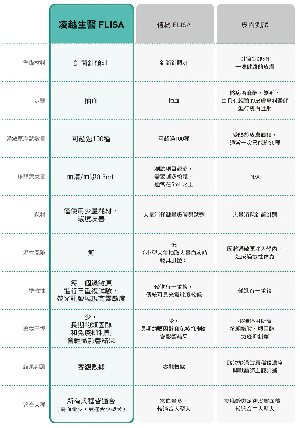 可依當地飲食習慣或所接觸之環境進行客製化萃取蛋白質抗原,開發出不同的純化萃取流程,例如會依照毛寶貝們習慣之食 用部位,對應出不同純化萃取方法,更能精準檢測出貼近臨床之風險性;利用微型化抗原點製技術將萃取的抗原精準 地點至玻璃載體上;螢光免疫吸附技術將血清中的生化訊息經雷射激發螢光後,蒐集螢光訊號呈現的強弱進行分析;凌 越擁有分析這些訊號的成熟經驗,能夠將這些龐大的數據轉化為具臨床意義的參考報告。