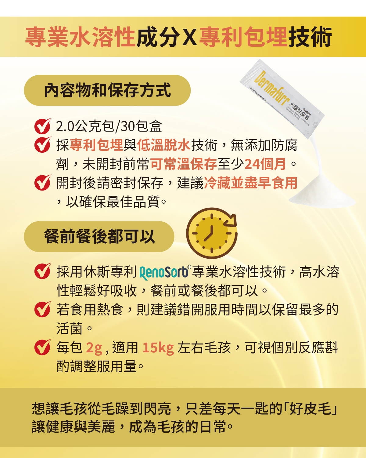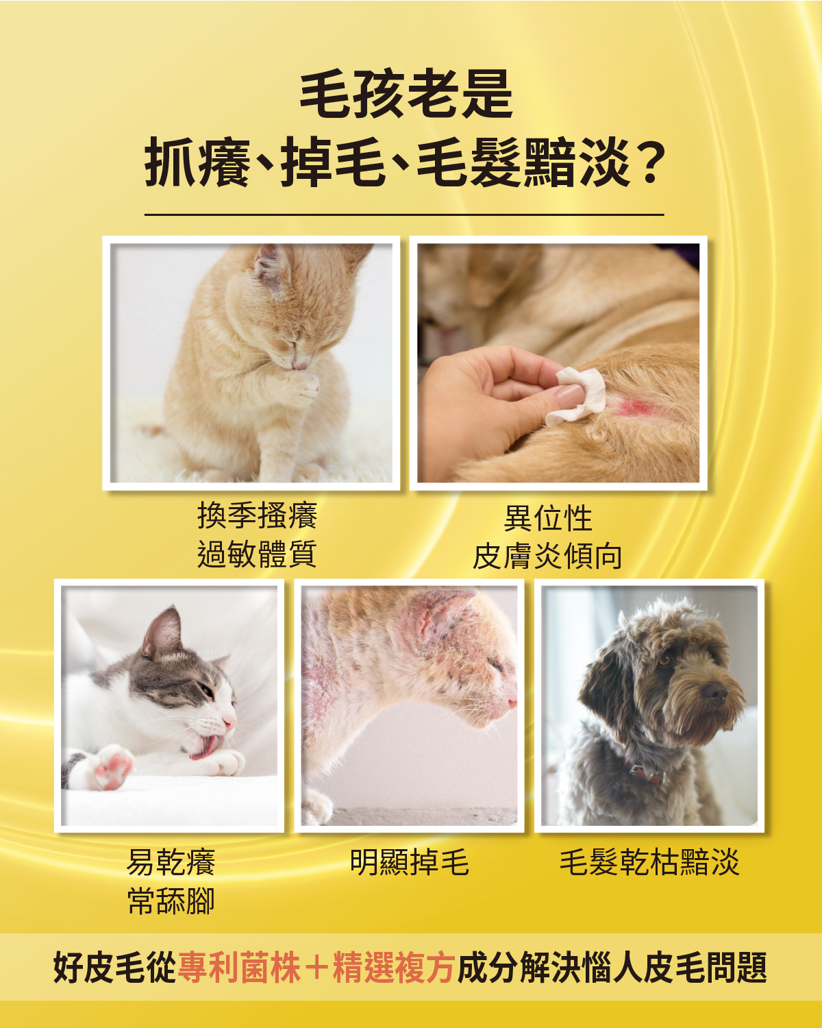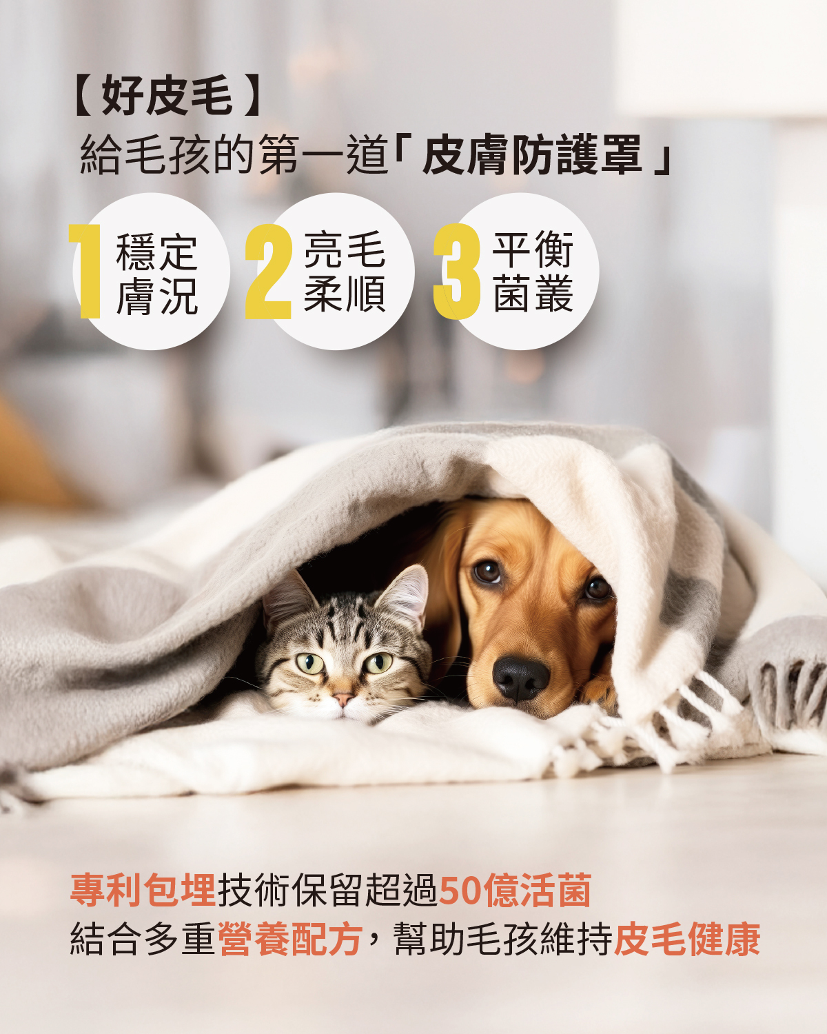 如果毛孩有皮膚健康相關的需求,使用好皮毛可以幫助保護皮膚,平衡免疫系統,平衡腸道菌叢,促進皮膚健康,幫助維持毛孩生活品質。