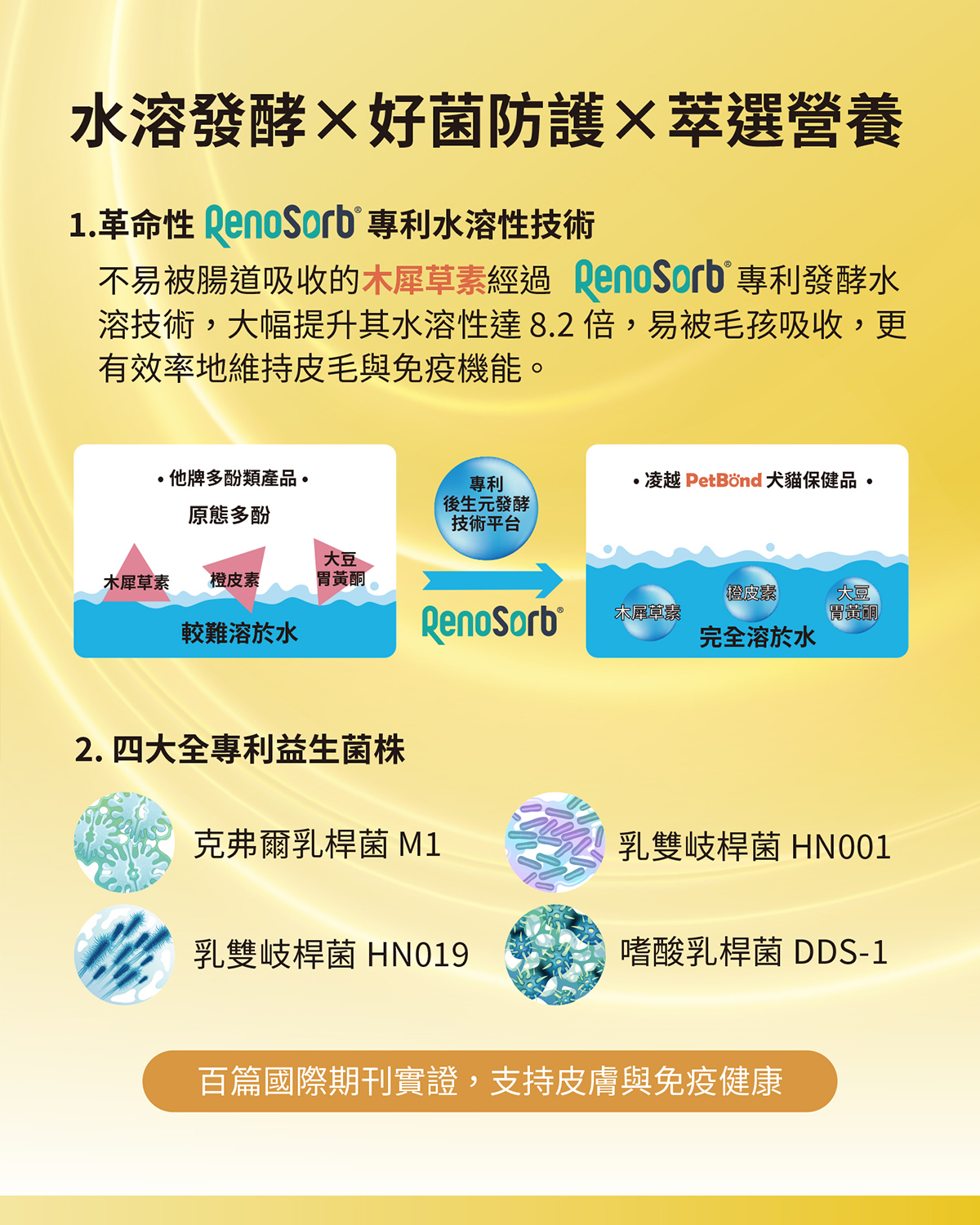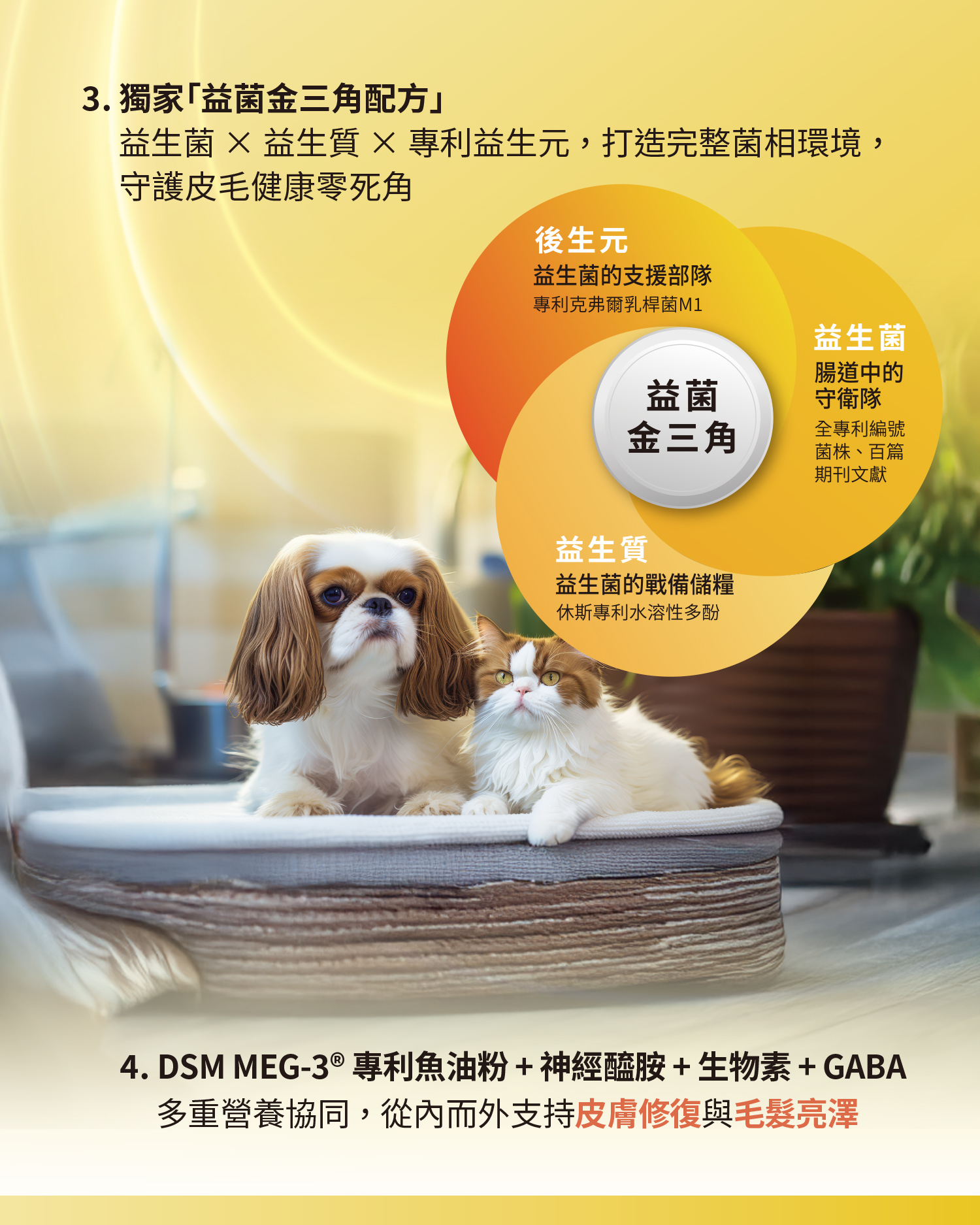 與休斯動物生技攜手打造,業界唯一採用 RenoSorb® 專利技術讓木犀草素的生物可利用率達8.2倍,有效提升毛孩保健品的營養吸收度,並添加全球最大食品級DSM- MEG-3®專利魚油粉, 幫助毛孩保健皮毛,雙管齊下打造毛孩好皮膚與豐盈光澤毛髮。